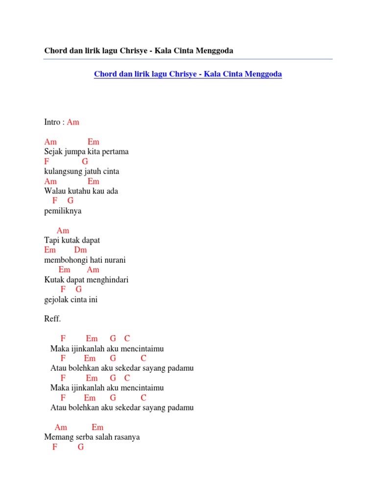 It was released by Musica Studios and it also was his 17th album. Intro C GB Am Am GB Dm Verse Am Em Sejak jumpa kita pertama Dm G ku langsung jatuh cinta Am Em Walau kutahu kau ada Dm G pemiliknya Am Tapi ku tak dapat G F membohongi hati nurani Dm Em Ku tak dapat menghindari F G gejolak cinta ini Chorus F C GB Am G Maka izinkanlah aku mencintaimu F C GB Dm Em Atau bolehkan aku sekedar sayang padamu F C GB Am G Maka. Terimakasih sudah menontonItulah tutorial not angka pianika lagu kala cinta menggoda noahDi dalam video terdapat tempo normal dan tempo pelan agar lebih memu.
