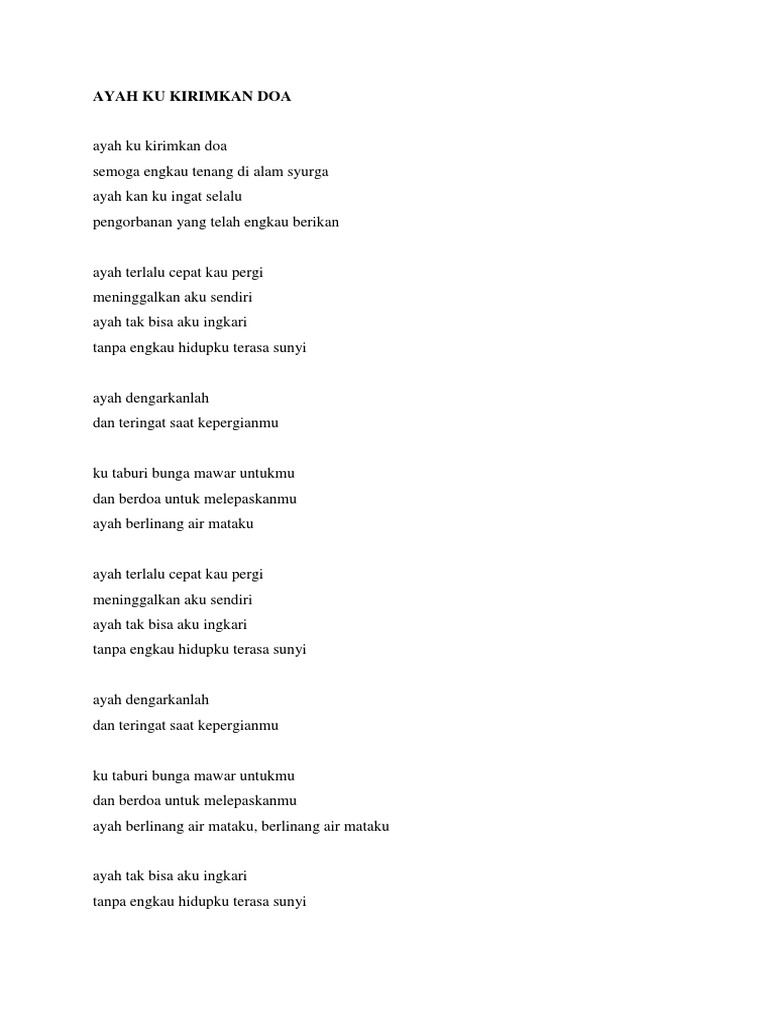 Berikut Lirik Lagu Ayah Ku Kirimkan Doa Laoneis Band Terbaru 2017 ayah ku kirimkan doa semoga engkau tenang di alam syurga ayah kan ku ingat selalu pengorbanan yang telah engkau berikan ayah. Selamat datang di blog saya blog saya berisi artikel Tekno Sport Kesehatan Social media Music youtube Instagram Dan berita menarik lainnya. Not pianika hayyul hadi.
