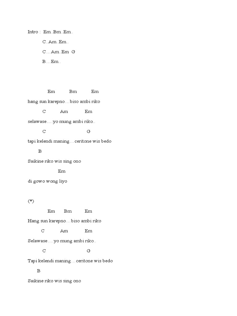 Intro F B C F Gm Dm Cm F B C F Bm F Bm Cm Bm F C F C Verse F Am Dm Am Wes sakmestine ati iki nelongso B C F Wong sik tak tresnani mblenjani janji Gm C F Dm Opo ora. Chorus Bm nelongso atiku. C pancen kabeh podo G pengen urip mulyo D G wiwitan rekoso.